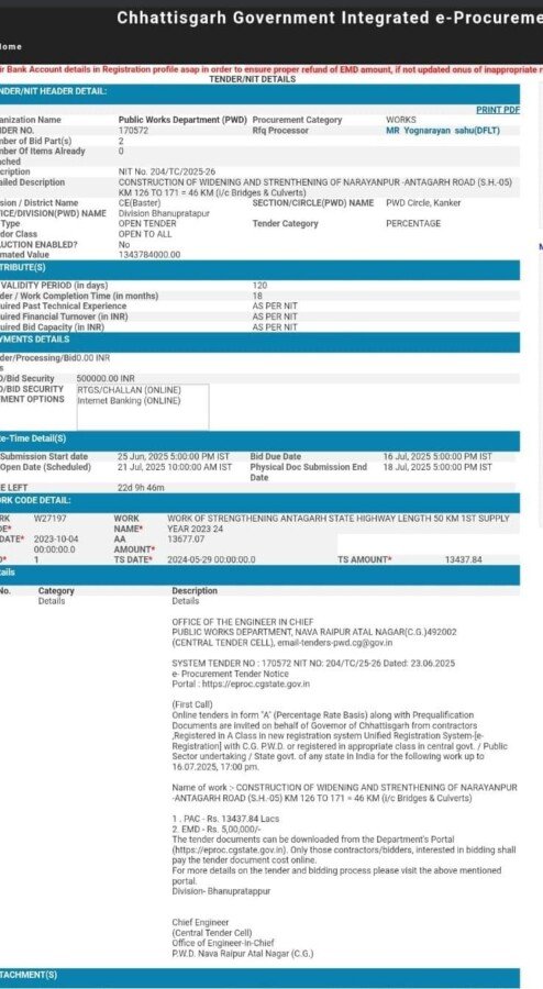 नारायणपुर, 24 जून 2025। नारायणपुर से अंतागढ़ के बीच खराब सड़क की वर्षों पुरानी समस्या अब खत्म होने वाली है। छत्तीसगढ़ लोक निर्माण विभाग ने SH-05 के किमी 126 से 171 तक के हिस्से की चौड़ीकरण और मजबूतीकरण के लिए 134.37 करोड़ रुपये की लागत से टेंडर जारी कर दिया है। इस सड़क की कुल लंबाई 46 किलोमीटर होगी, जिसमें पुल-पुलियों सहित सभी निर्माण कार्य शामिल होंगे। कार्य की समय-सीमा 18 माह निर्धारित की गई है।