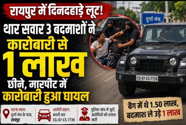रायपुर में सोमवार दोपहर एक सनसनीखेज लूट की वारदात सामने आई। आमानाका थाना क्षेत्र में तीन बदमाशों ने थार गाड़ी से आकर एक कारोबारी पर हमला किया और उससे 1 लाख रुपए लूटकर फरार हो गए।