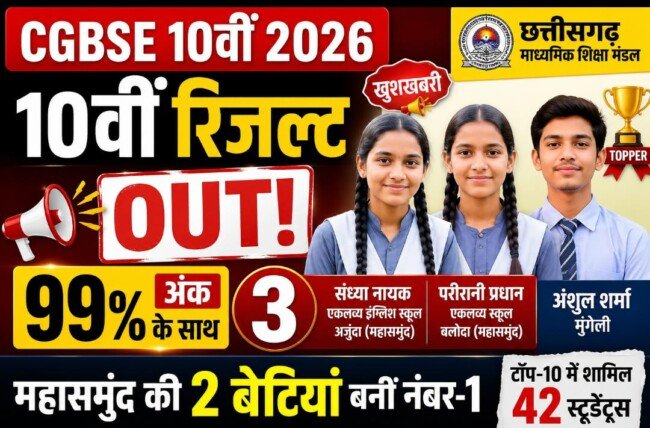 छत्तीसगढ़ बोर्ड 10वीं रिजल्ट जारी: 3 छात्रों ने 99% अंक से किया टॉप, महासमुंद की 2 बेटियां अव्वल, 42 पहुंचे टॉप-10 में