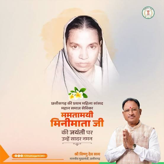 रायपुर! मुख्यमंत्री विष्णुदेव साय ने छत्तीसगढ़ की प्रथम महिला सांसद और समाजसेविका स्वर्गीय मिनीमाता जी की पुण्यतिथि पर उन्हें नमन किया है। मुख्यमंत्री साय ने कहा कि मिनीमाता जी ने अपना संपूर्ण जीवन समाज के वंचित वर्गों, महिलाओं, दलितों और गरीबों के अधिकारों की रक्षा एवं उत्थान के लिए समर्पित किया।
