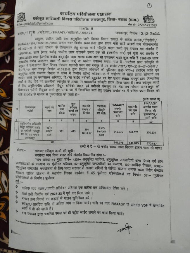 डमरू कश्यप,जगदलपुर। प्रधानमंत्री आदर्श ग्राम योजना (PMAAGY) के अंतर्गत बस्तर अंचल के 184 ग्रामों में स्ट्रीट लाइट कार्यों के लिए छत्तीसगढ़ शासन द्वारा कुल ₹31.69 करोड़ की प्रशासकीय स्वीकृति प्रदान की गई थी। इसमें राजस्व मद के तहत ₹12.40 करोड़ और पूंजी मद के तहत ₹19.28 करोड़ का आबंटन किया गया था। आदेश क्रमांक /1170/ परि. प्रशा/PMAAGY/सांख्यिकी/2022-23, दिनांक 12 दिसंबर 2022 के अनुसार 541.075 लाख रुपये की स्वीकृति दी गई, जिसमें से 270.537 लाख रुपये (दो करोड़ सत्तर लाख तिरपन हजार सात सौ रुपये) की पहली किस्त PFMS के माध्यम से अनुविभागीय अधिकारी विद्युत यांत्रिकी, लाईट एवं मशीनरी नलकूप एवं गेट उपसंभाग, जगदलपुर को जारी की गई।