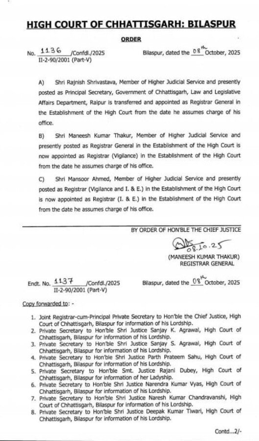 छत्तीसगढ़ हाईकोर्ट में बड़े पैमाने पर तबादले — रजनीश श्रीवास्तव बने महापंजीयक, मनीष ठाकुर को रजिस्ट्रार (सतर्कता) की जिम्मेदारी