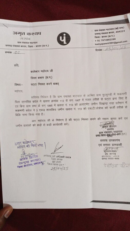 बस्तर! बस्तर विकासखंड के ग्राम पंचायत भाटपाल के आश्रित ग्राम भूरसुण्डी के ग्रामीणों ने शुक्रवार को कलेक्टर कार्यालय पहुंचकर फर्जी तरीके से बने पट्टों को निरस्त करने की मांग को लेकर ज्ञापन सौंपा। सरपंच अमृत कश्यप के नेतृत्व में पहुंचे ग्रामीणों ने बताया कि वर्ष 1987 में रूकमणी बघेल द्वारा खसरा क्रमांक 113 पर बिना ग्रामसभा की अनुमति के गलत तरीके से पट्टा बनवाया गया था। इसके बाद 1995 में इस जमीन को शासकीय भूमि के रूप में अलॉटमेंट कर दिखाया गया।